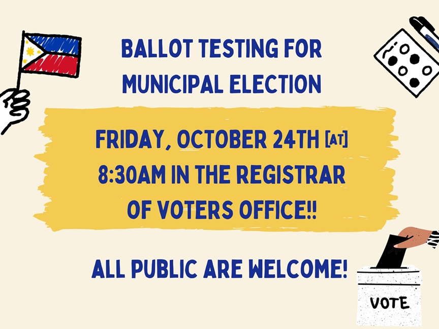 BALLOT TESTING FOR MUNICIPAL ELECTION WILL TAKE PLACE ON FRIDAY, OCTOBER 24TH AT 8:30AM IN THE REGISTRAR OF VOTERS OFFICE!