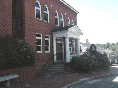 Town Hall now consists of two distinct buildings. The original Town Hall on Market Street was built for $22,000 around 1904 in a neo-gothic style with pointed arch windows. The Doric columned porch with its classical style is in contrast to the rest of the building. The large building on Main Street originally contained stores and had offices above. It is a typical commercial structure of the late nineteenth century with stone embellishments, cast iron columns, and heavy granite sills. The Main Street portion replaced Gothic Hall after it burned in 1887. Gothic Hall included a billiard parlor and meeting space for the Masons and Odd Fellows.