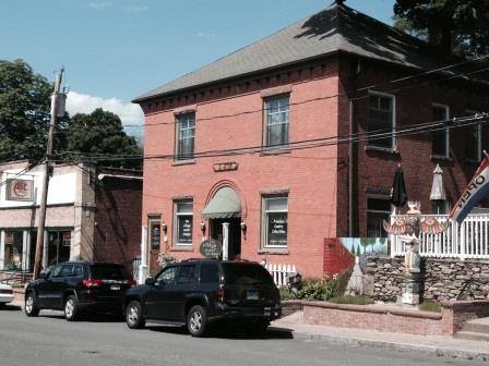 This hip roofed building was built as a post office in the early 20th century. It is typical of commercial buildings of its time with generous windows and an arched doorway.