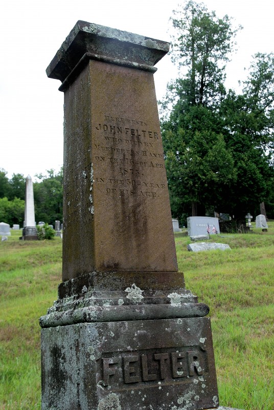 “Died by Murderer’s Hand” reads the lichen-encrusted brownstone pillar erected to John Felter (1825-1875). Felter was of German extraction and operated a boarding house just over the Canton line in Burlington with his wife Caroline, who owned the building. Killed in his own home, he was one of three who would die from stabbings received on the night of April 16, 1875 in one of the most grisly episodes ever witnessed in Collinsville.